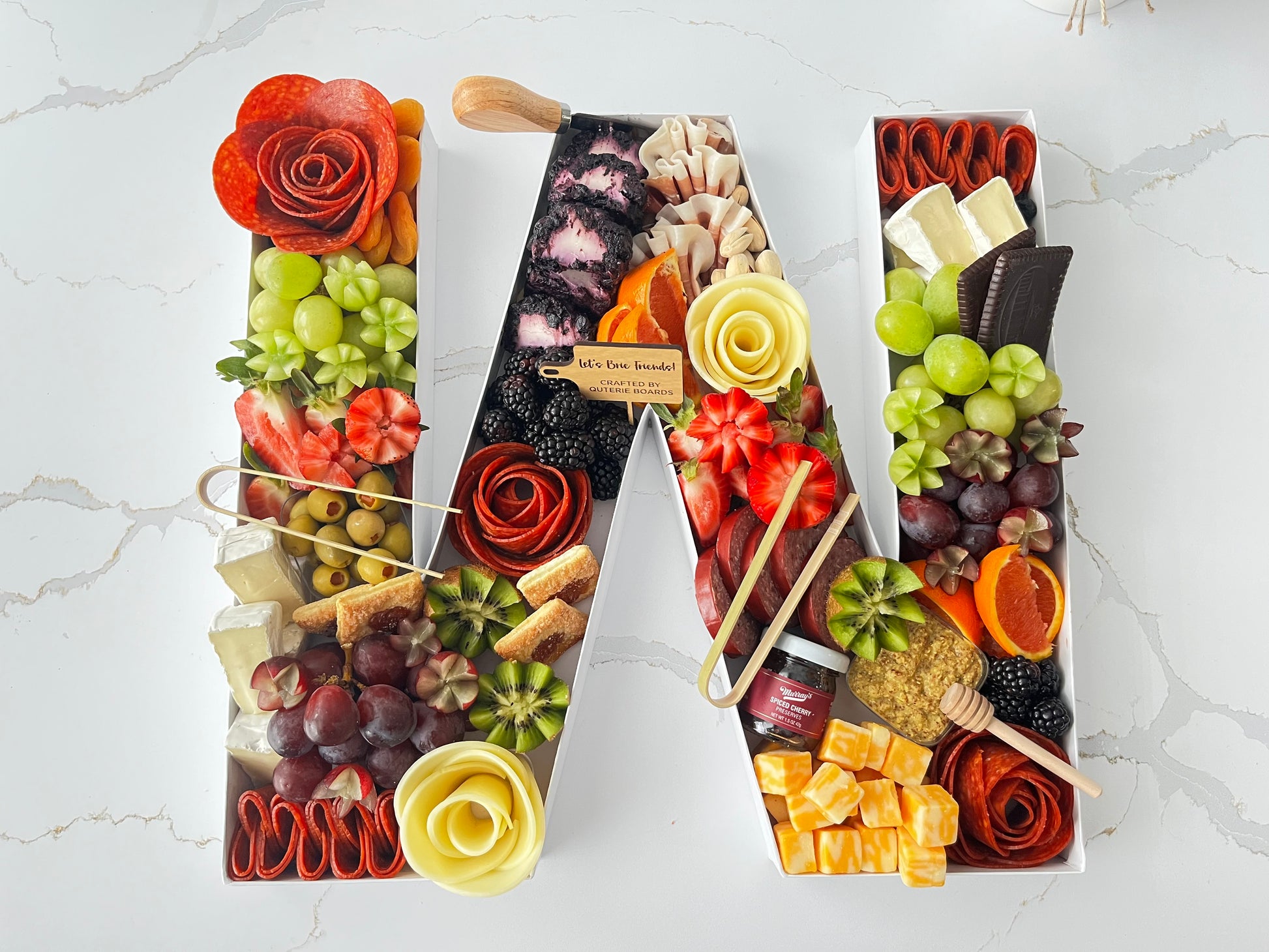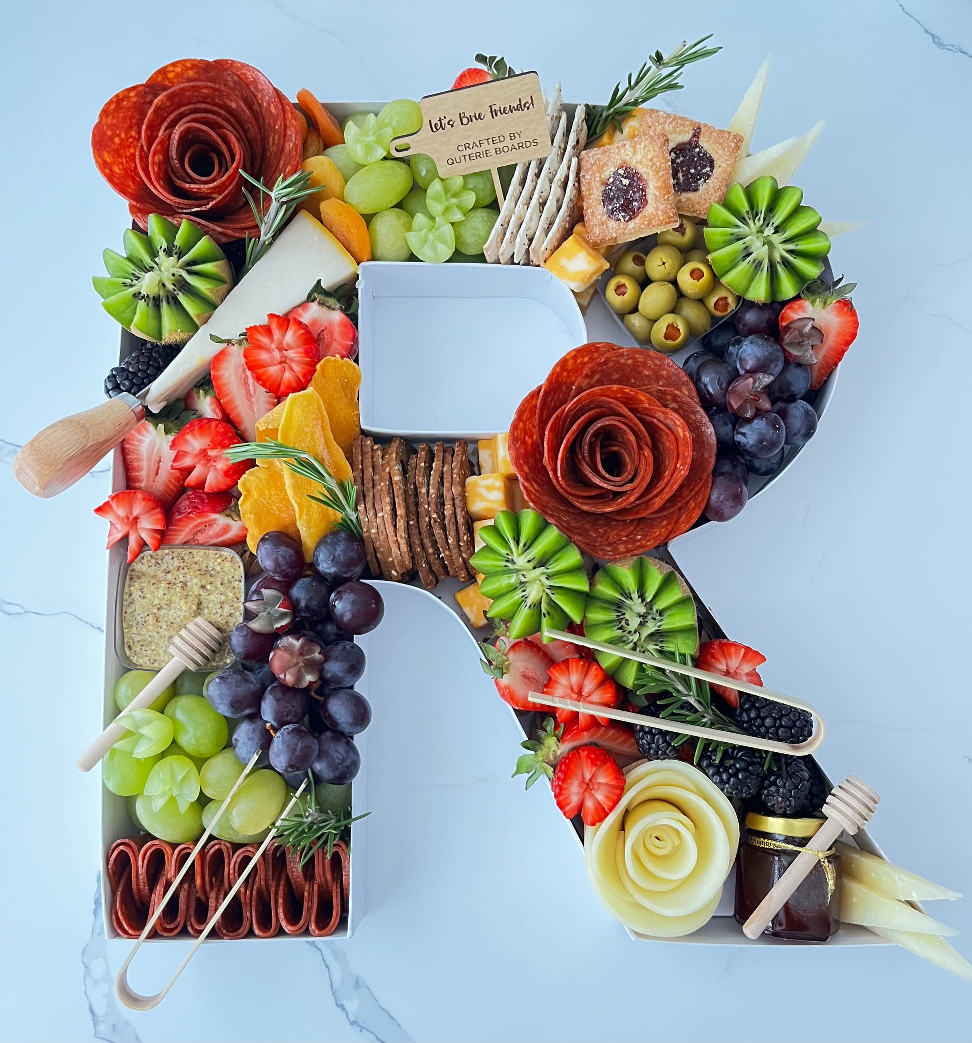 Make your next event unforgettable with our Custom Charcuterie Letters and Numbers. Each 12.5” piece can be tailored to showcase your company name, event date, or special occasion. Filled with a delicious assortment of gourmet cheeses, cured meats, fresh fruit, and accompaniments, these unique creations are both a stunning visual centerpiece and a crowd-pleasing treat.
